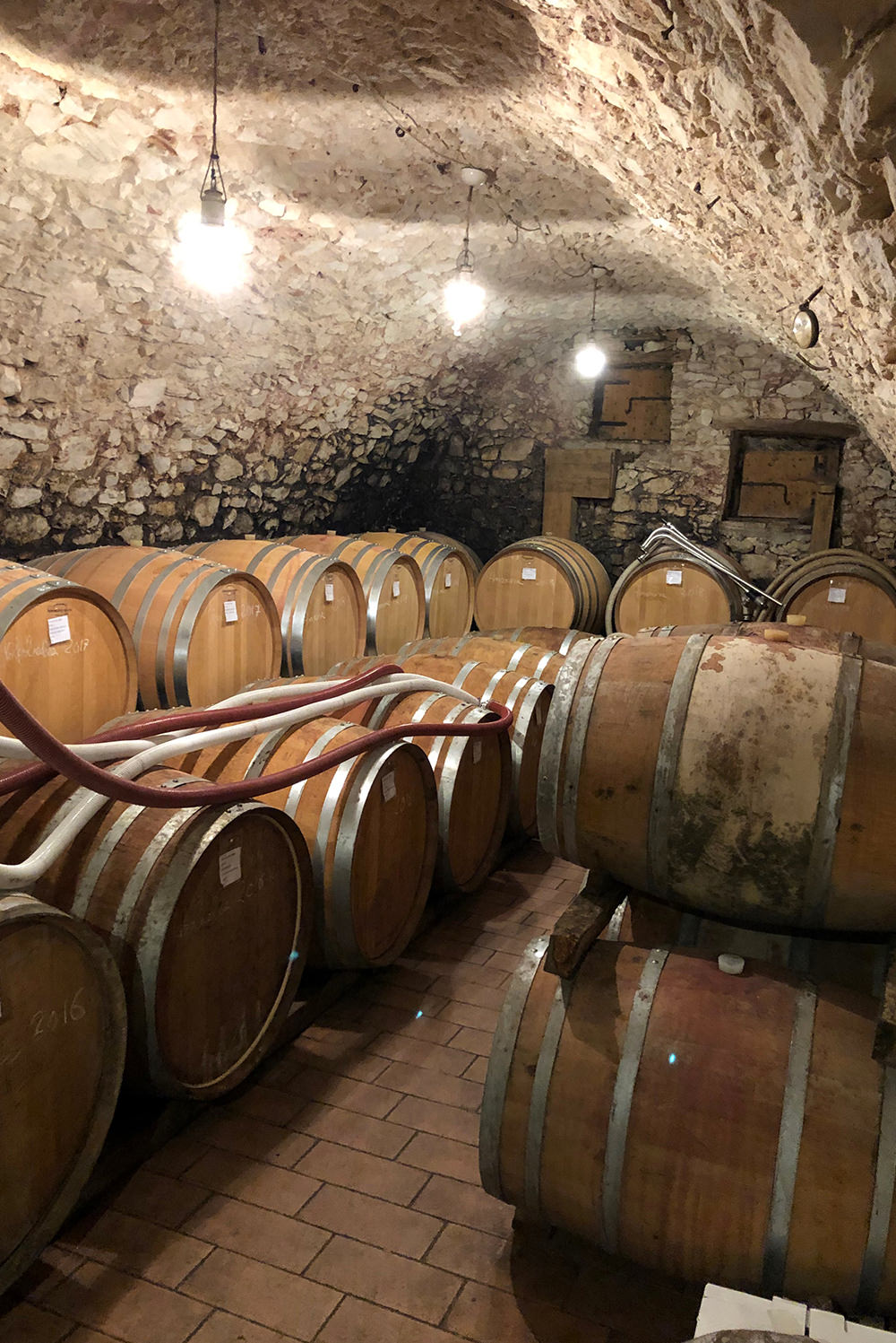 We arrive on a dirt road, winding its way between traditional dry stone walls. Around us there are houses, olive trees, fruit trees, meadows, fields. A small vineyard can be seen at the top of the hill. Below us, vines are also grown at the bottom of the valley where we would expect other crops.